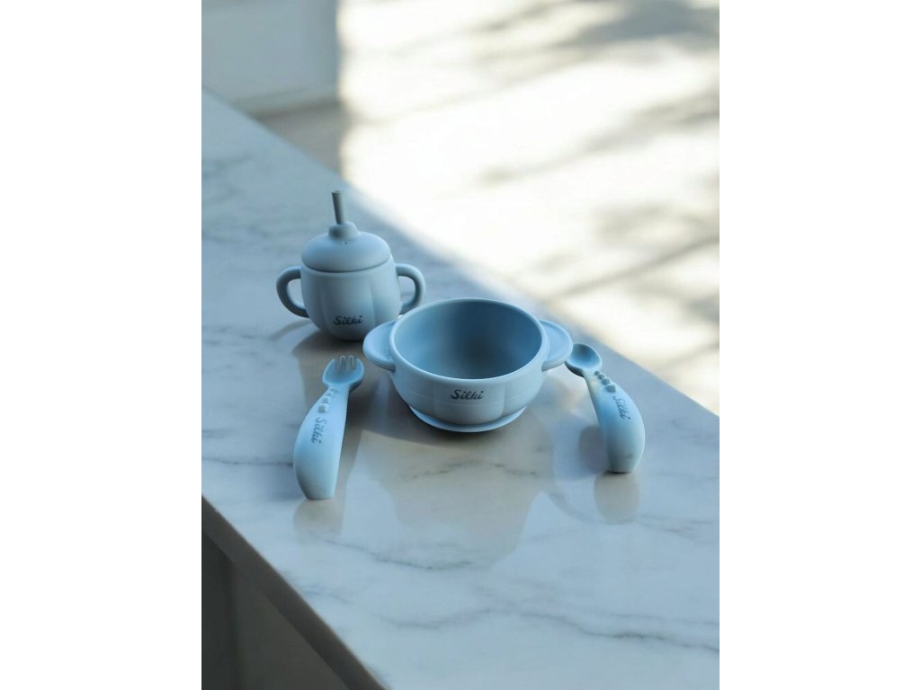 Veškeré části sady jsou vyrobeny z kvalitního potravinářského silikonu, který je odolný, neobsahuje BPA, ftaláty ani jiné škodlivé látky, je jemný k dásním a zoubkům a zároveň odolný vůči teplu. Sadu lze bez obav mýt v myčce i používat v mikrovlnné troubě. Díky stylovému designu v jemně modré barvě potěší nejen děti, ale i rodiče, kteří ocení její praktičnost a moderní vzhled.