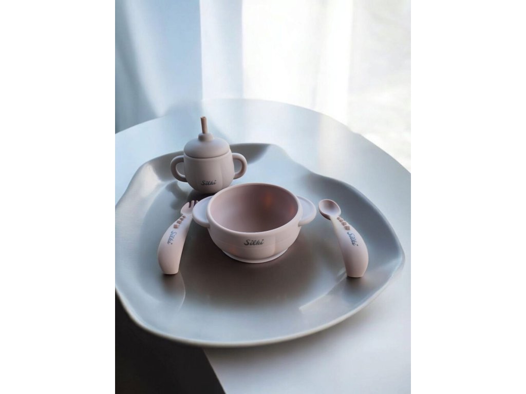 Obsahuje hrníček, misku a dětský příbor – vše vyrobeno z bezpečného, měkkého silikonu, který je šetrný k dásním a snadno se čistí.
