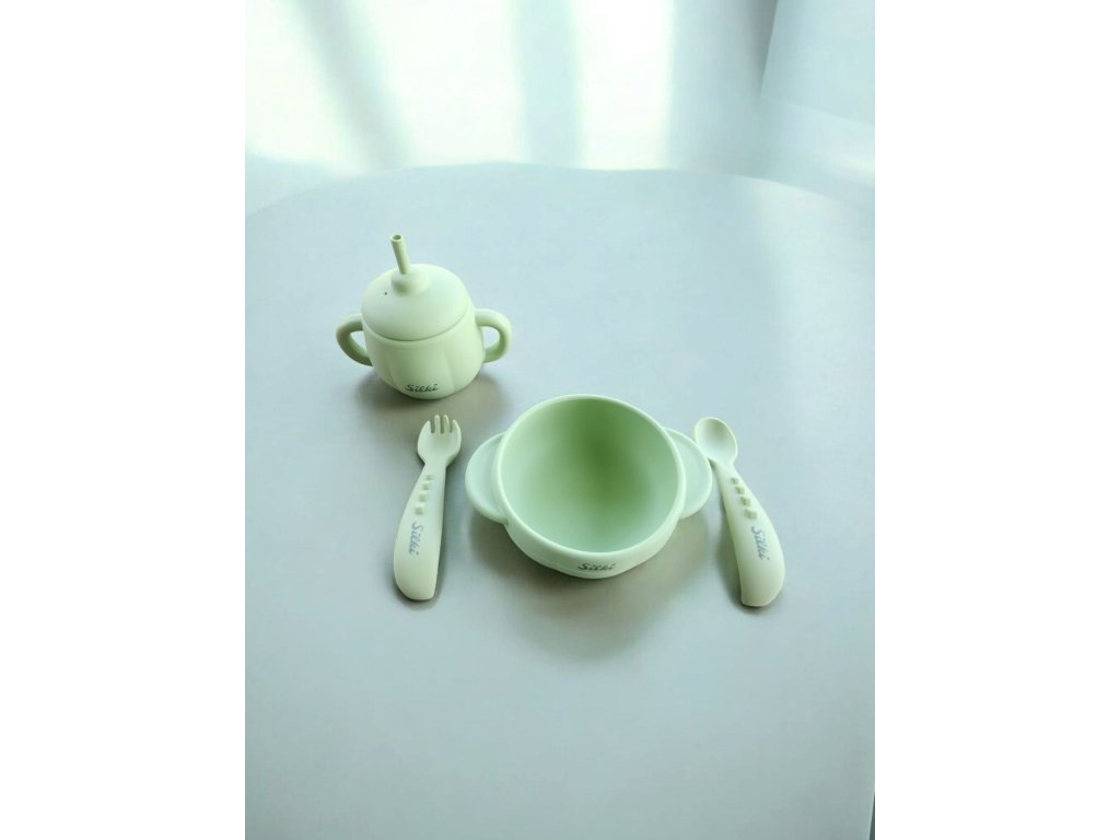 Zelená sada silikonového nádobí je praktická a bezpečná volba pro každodenní stolování malých dětí. Sada obsahuje tři základní kousky: hrníček s pohodlným úchopem ideálním pro dětské ručičky, hlubokou misku s přísavkou pro stabilitu během jídla a ergonomicky tvarovaný příbor (lžičku a vidličku), který je navržen s ohledem na první pokusy dítěte o samostatné jedení.